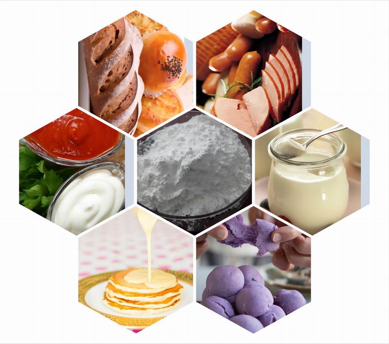 Thickening and shaping agent, to make soft pudding, gravy fillings, pulps, dehydrated soups, spices and juice gummies; adhesives are used in skin care products and fish feed;